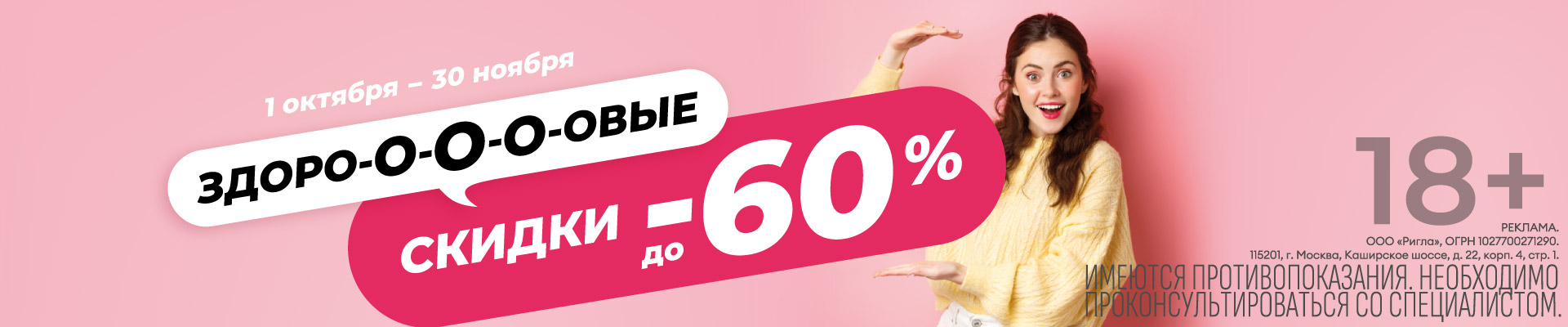 Акция проводится в период с 01.10.2025 по 30.11.2025. При применении карты лояльности на акционный ассортимент действует скидка от 10% до 60%. Ассортимент акции, период действия скидки, размер скидки в аптеках, на сайте и в мобильном приложении может различаться. Полные условия акции смотрите здесь.